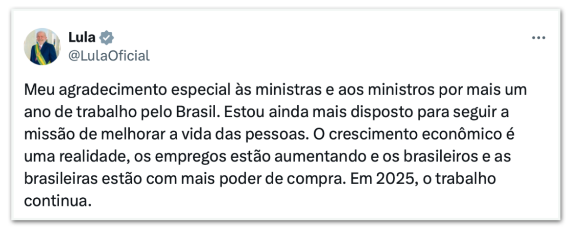 O presidente Luiz Inácio Lula da Silva (PT) publicou em suas redes sociais, neste sábado (21.dez.2024), uma mensagem em que agradece o trabalho de seus ministros em 2024. Segundo o chefe do Executivo, “o crescimento econômico é uma realidade, os empregos estão aumentando e os brasileiros e as brasileiras estão com mais poder de compra”.