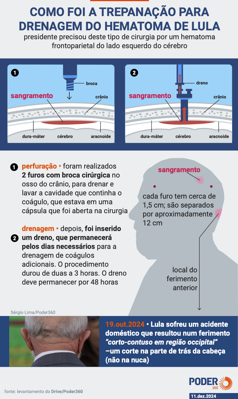 O presidente Luiz Inácio Lula da Silva (PT), 79 anos, está proibido de fazer atividades físicas ou usar substâncias que possam ter efeito vasodilatador por cerca de 60 dias. A medida é necessária para que a região da cabeça atingida por uma hemorragia em 10 de dezembro regrida para uma condição que não o coloque em risco de ter um novo episódio de sangramento intracraniano.