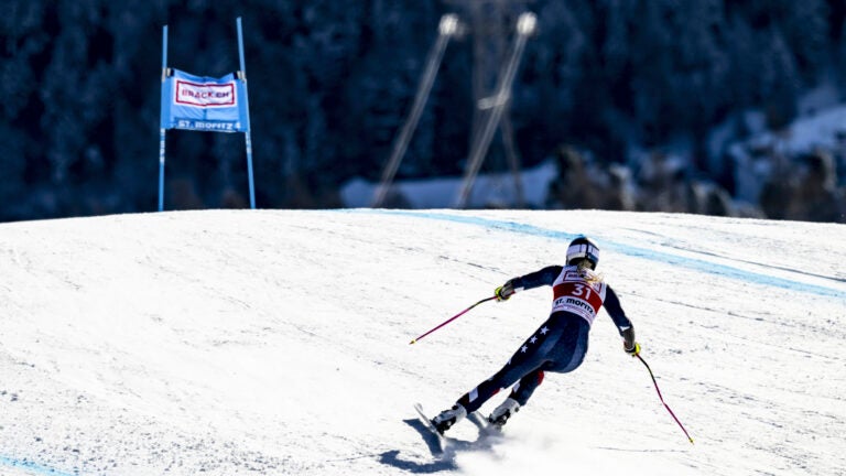 Lindsey Vonn competindo no evento super-G da Copa do Mundo em St. Moritz, Suíça, no início de dezembro. Jean-Christophe Bott/Keystone via AP