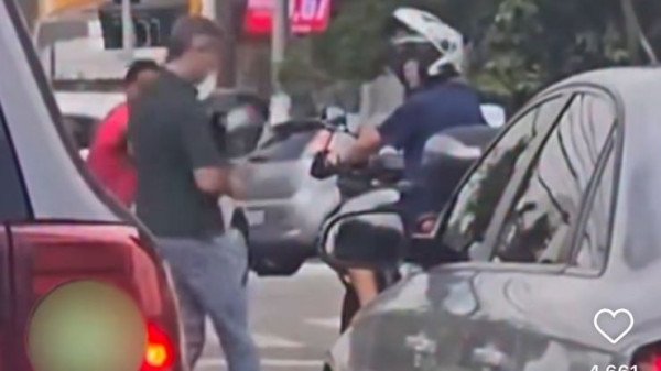 Em um vídeo que circula pelas redes sociais, é possível ver dois criminosos, um deles armado, tentando roubar a moto de um homem.