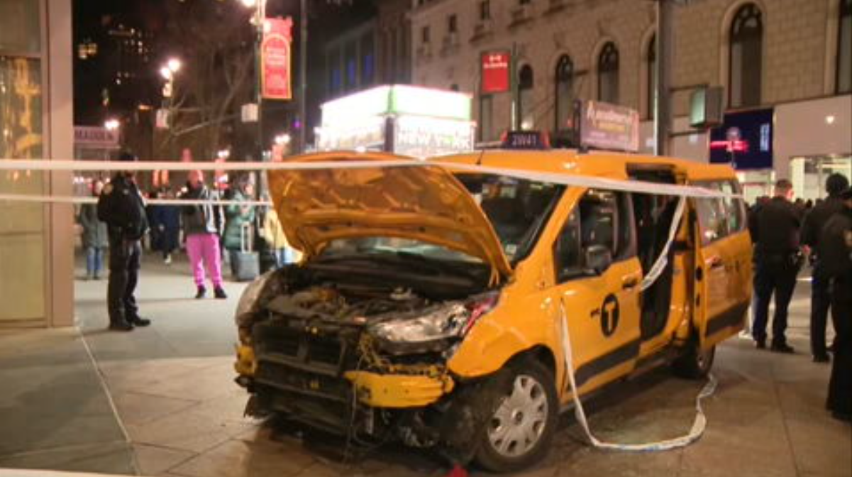 Imagens de vídeo no local mostraram um táxi amarelo danificado na calçada isolado por fita policial. O para-choque dianteiro do carro parecia ter caído. O táxi foi rebocado no final da noite.