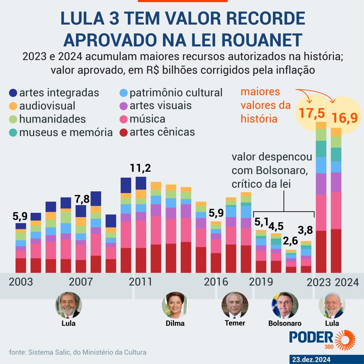 A Lei Rouanet captou R$ 2,4 bilhões em 2024 para projetos culturais. O valor autorizado pelo governo do presidente Luiz Inácio Lula da Silva (PT) foi de R$ 16,9 bilhões, o 2º maior da história do programa, perdendo apenas para 2023.