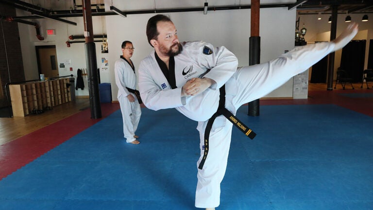 No CW Taekwondo em Boston, o diretor musical do BSO, Andris Nelsons, trabalha com o instrutor principal Dan Chuang. Nelsons está tentando manter a forma e voltou à paixão de infância, o Taekwondo. (Suzanne Kreiter/equipe da Globe)