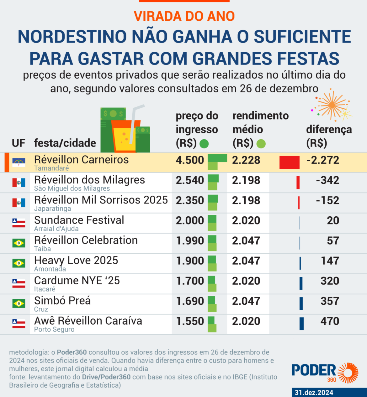 Um dos exemplos mais discrepantes é o Réveillon Carneiros, realizado em Pernambuco. O preço do ingresso para 31 de dezembro varia de R$ 5.000 para homens e R$ 4.000 para mulheres –média de R$ 4.500. É mais que o dobro do que o rendimento geral de uma pessoa ocupada no Estado (R$ 2.228).