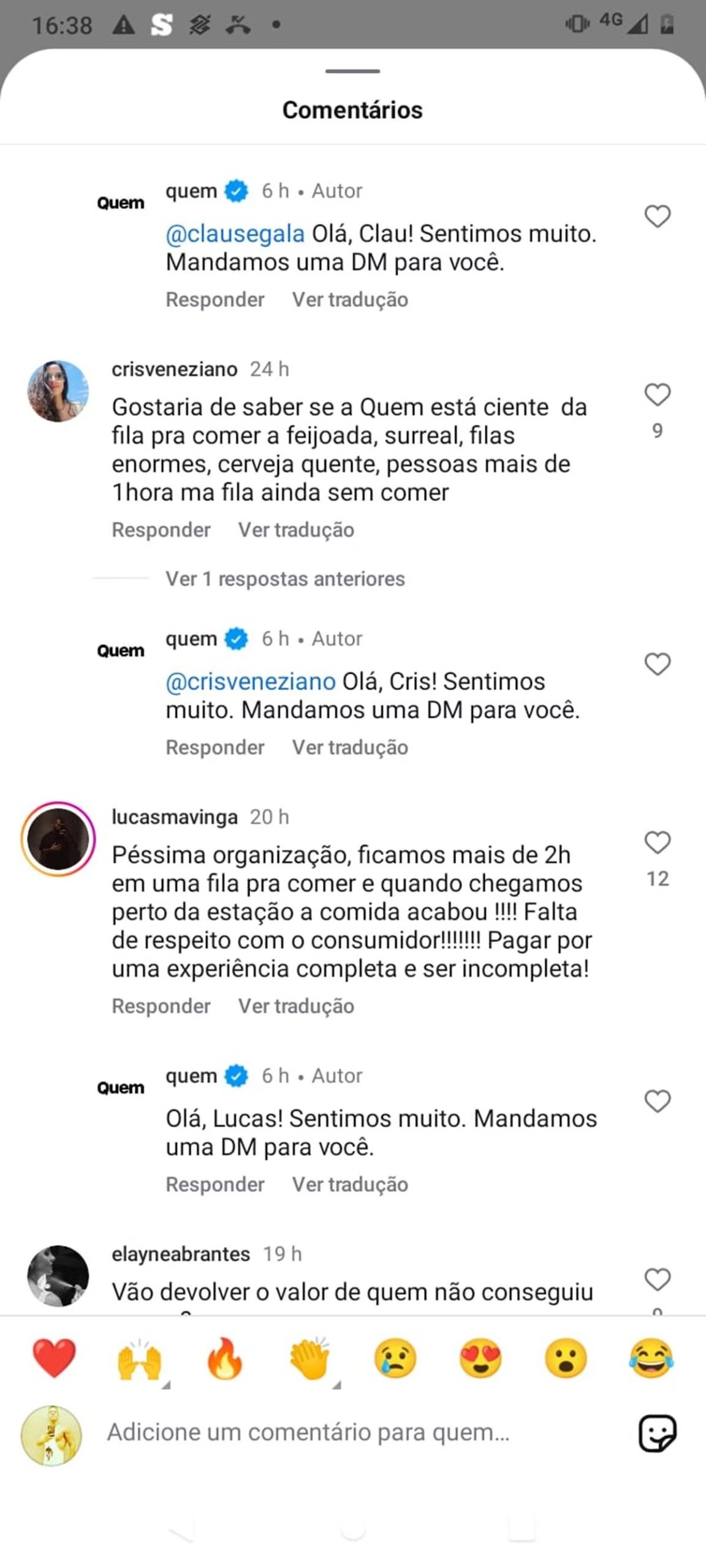 Procurada, a assessoria de imprensa da QUEM emitiu um comunicado. “A produção da feijoada QUEM foi feita pela Party Industry. A Quem lamenta pelos transtornos causados ao público e está trabalhando para que a experiência não se repita”, comentou.