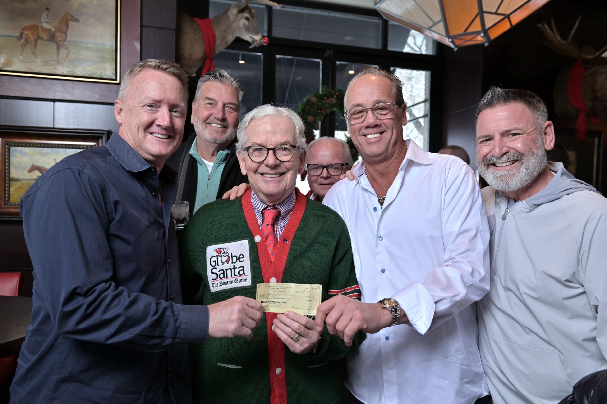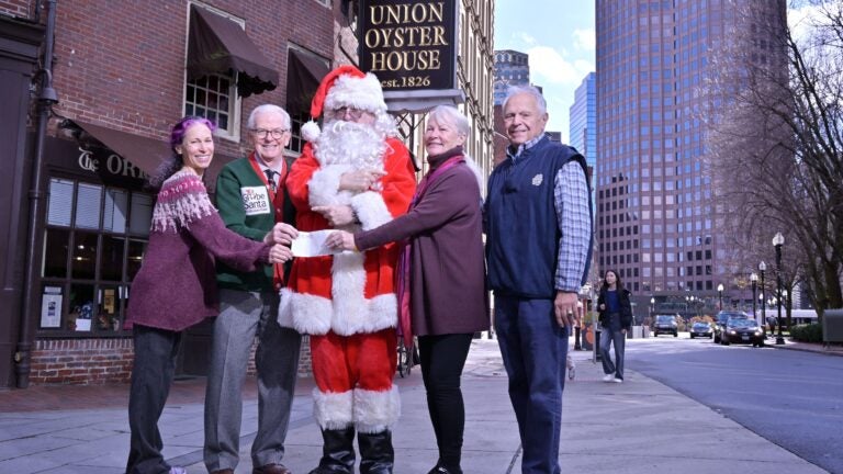 A partir da esquerda: Kricket Milano, Jill Milano e o proprietário da Union Oyster House, Joseph A. Milano, juntaram-se ao Globe Santa e ao diretor executivo do Globe Santa, Bill Connolly, para apresentar uma doação de US$ 5.000 para ajudar a entregar presentes para crianças carentes neste Natal. Josh Reynolds para o Boston Globe