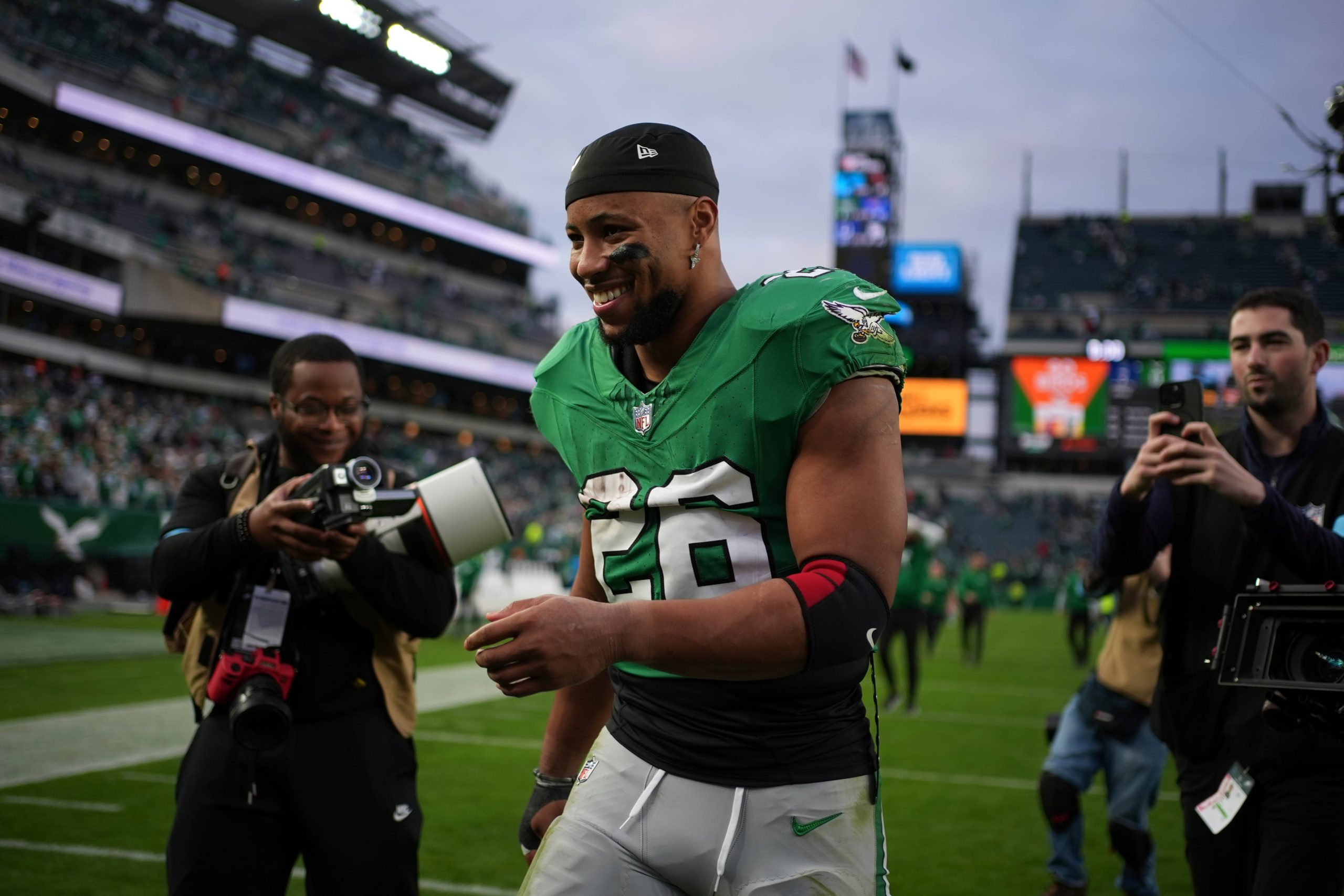 Quanto a Barkley, além de se tornar o primeiro jogador dos Eagles a correr para 2.000 jardas, ele também estabeleceu o recorde da franquia de jardas em scrimmage no domingo contra os Cowboys, chegando a 2.283. É o 12º de todos os tempos na lista da NFL. LeSean McCoy anteriormente detinha o recorde da equipe com 2.146 jardas em 2013. Ele foi espetacular naquela temporada, especialmente quando você considera que 539 dessas jardas foram aéreas, onde ele teve uma média de 10,4 jardas por recepção.