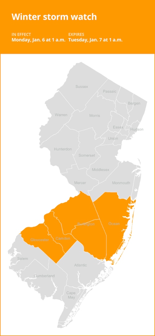 Um alerta de tempestade de inverno foi emitido pelo Serviço Meteorológico Nacional no sábado às 2h09, válido de segunda-feira à 1h até terça-feira à 1h para os condados de Gloucester, Camden, Burlington e Ocean.
