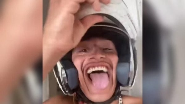 No primeiro vídeo, o jovem aparece rindo enquanto usa o capacete. Ele diz que só iria entregar o equipamento se sua moto fosse devolvida.