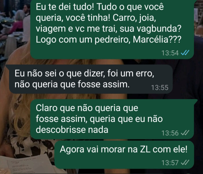 O caso ganhou ainda mais repercussão após o empresário, devastado pela traição, compartilhar prints de uma conversa com a esposa no grupo de amigos. No bate-papo, ele desabafa: “Eu te dei tudo! Você tinha tudo o que queria […] agora tu vai morar com ele na ZL!”