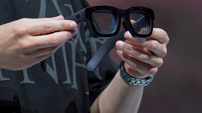 Mark Zuckerberg segura um par de óculos Orion AR durante a conferência Meta Connect, em 25 de setembro de 2024, em Menlo Park, Califórnia. AP Photo/Godofredo A. Vásquez, Arquivo