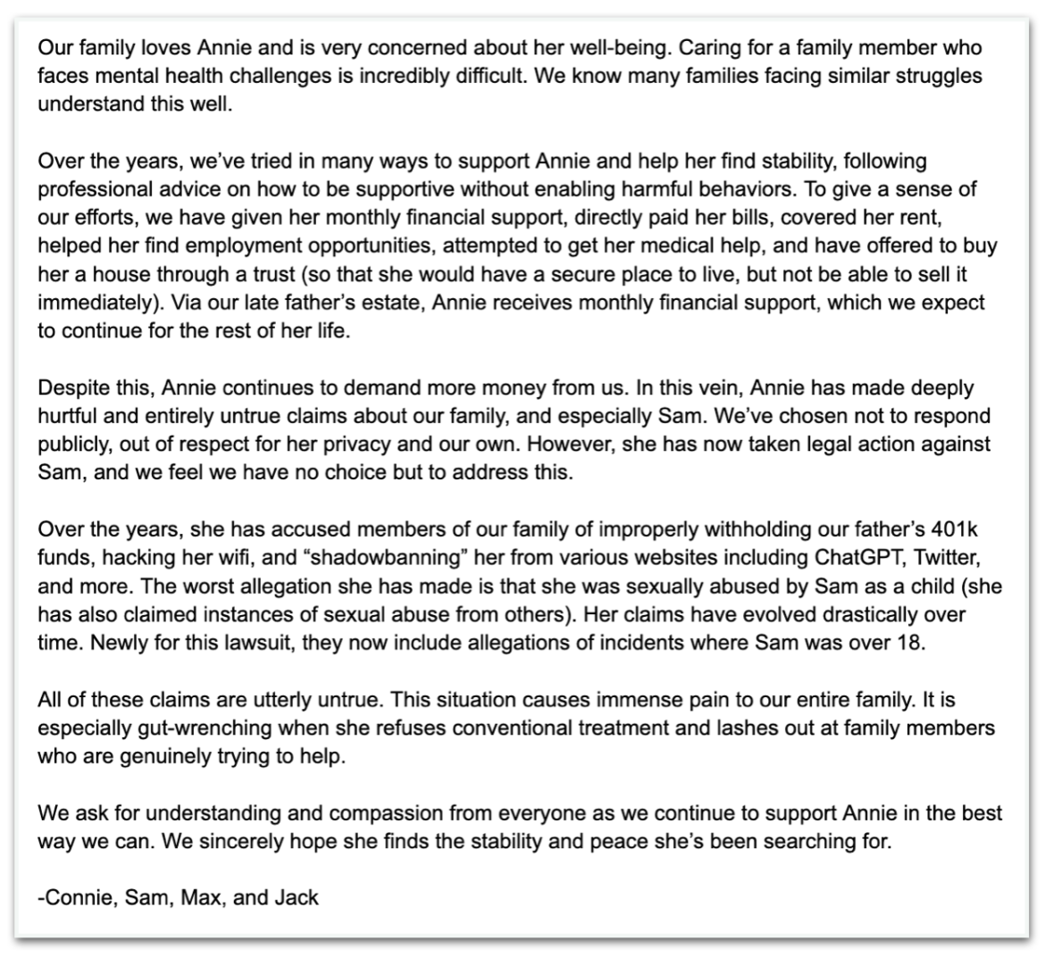 Sam divulgou na 3ª feira (7.jan) uma carta no X (ex-Twitter) assinada por ele, por sua mãe e por 2 irmãos. “Annie fez declarações completamente falsas e prejudiciais sobre nossa família, e especialmente sobre Sam”, diz o texto.