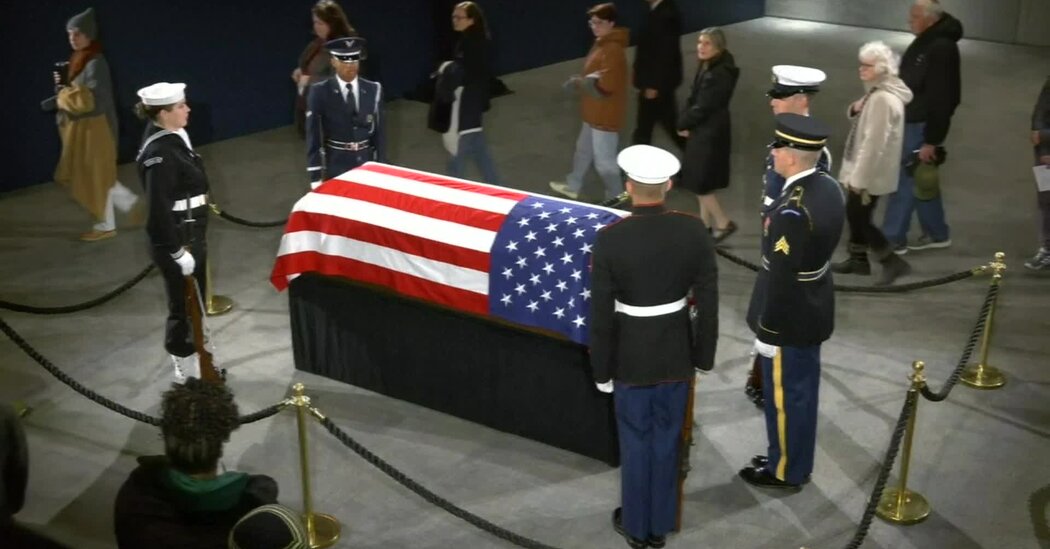 A biblioteca estava aberta 24 horas por dia desde a noite de sábado, permitindo que qualquer um que quisesse subir ao caixão coberto com uma bandeira americana o fizesse – para fazer uma oração, fazer uma saudação, assistir à troca da guarda, chorar ou chorar. apenas fique ali e saboreie a imersão em um momento que parecia um pedaço da história.