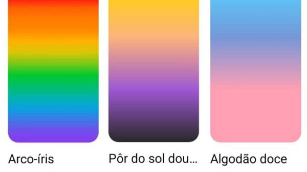 A imagem apresenta três paletas de cores verticais. A primeira paleta, intitulada ‘Arco-íris’, exibe um gradiente de cores que vai do vermelho ao roxo. A segunda paleta, chamada ‘Pôr do sol dou…’, apresenta um gradiente que transita do amarelo ao roxo. A terceira paleta, intitulada ‘Algodão doce’, mostra um gradiente suave que vai do rosa ao azul claro.
