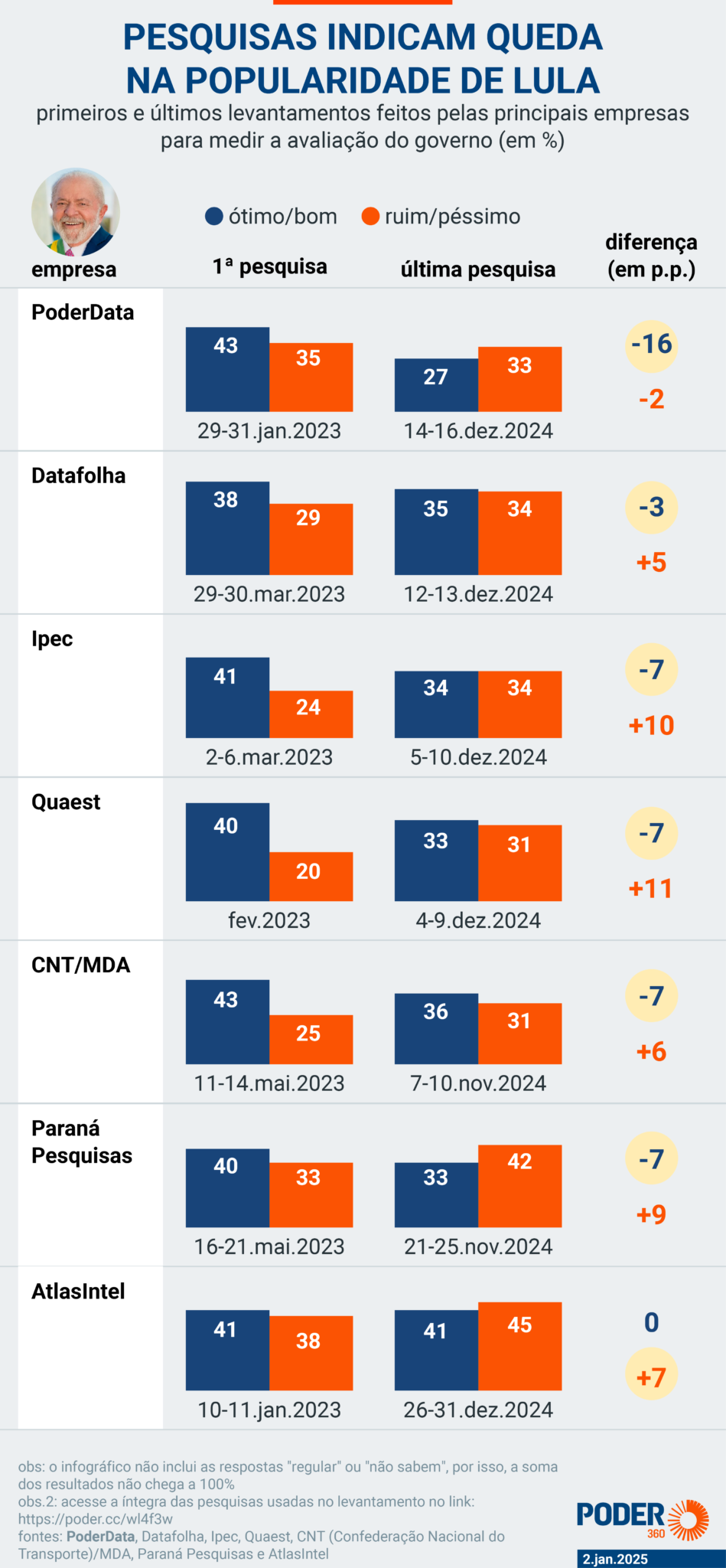 Até novembro de 2024, a desaprovação do presidente ficava na casa dos 45%. Cresceu em dezembro, mês em que o governo anunciou o pacote de corte de gastos. Confira: