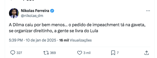 Nesta sexta-feira (10), o deputado federal Nikolas Ferreira (PL-MG) voltou a criticar o governo do presidente Lula (PT). Ele disse que o pedido de impeachment do petista já está na gaveta.