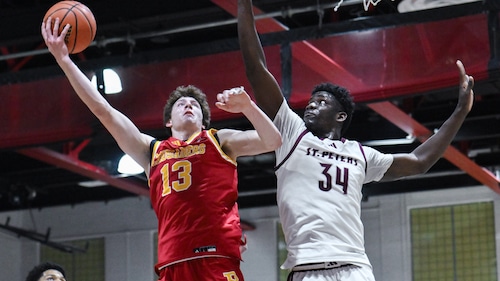 Declan Wucherpfennig (13) do Bergen Catholic arremessa a bola enquanto é defendido por Keiner Asprilla (34) da St. Peters Prep durante o jogo do torneio de basquete masculino Jump Off de Ano Novo na Paterson Kennedy High School em Paterson, NJ na quarta-feira, 1º de janeiro, 2025João Jones | Para NJ Advance Media