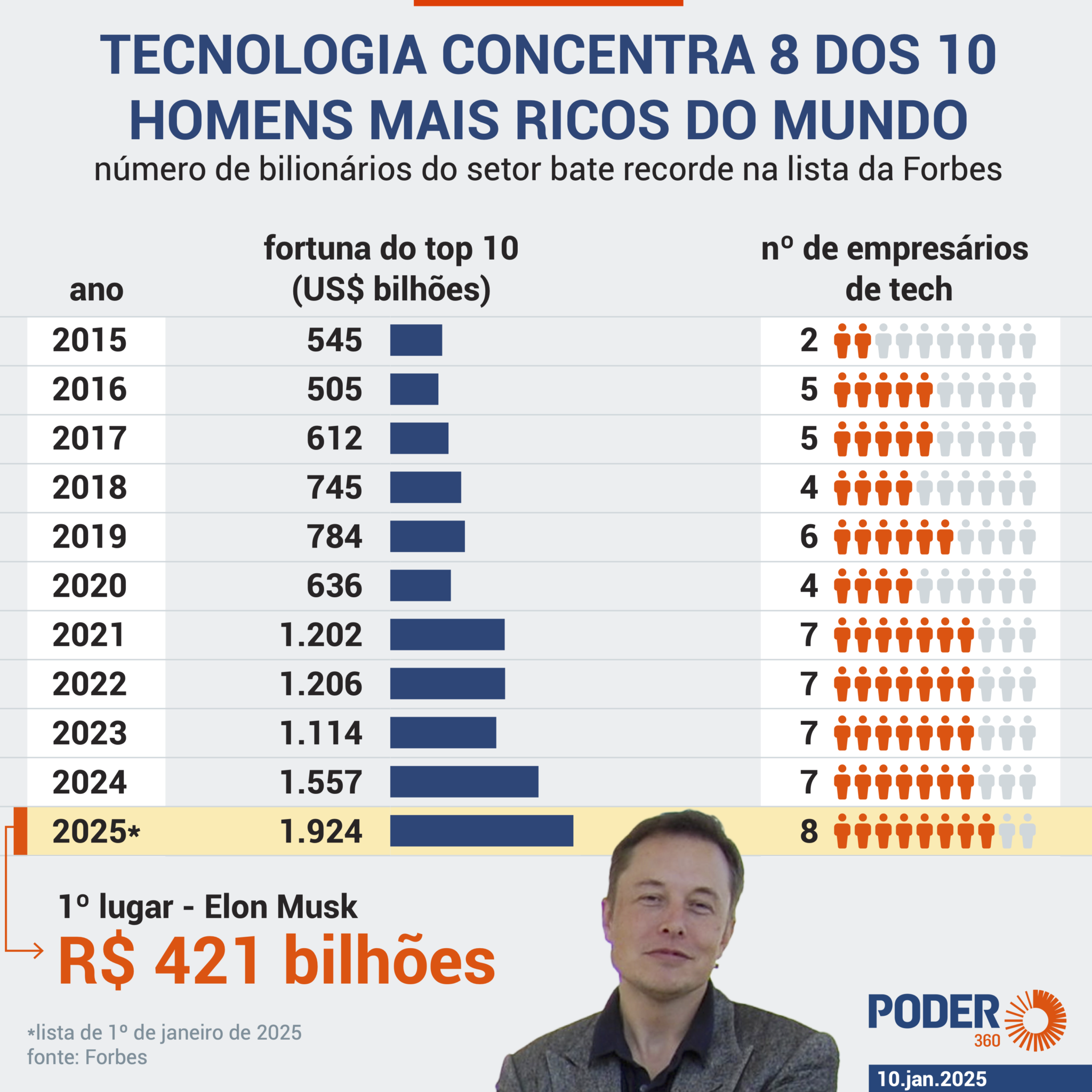 O setor de tecnologia concentra 8 das 10 pessoas mais ricas do mundo segundo lista divulgada pela revista Forbes em janeiro. O número é recorde nos rankings da revista norte-americana. Dos US$ 1.924 trilhões acumulados pelo top 10, US$ 1.514 trilhões são apenas de bilionários de tech.