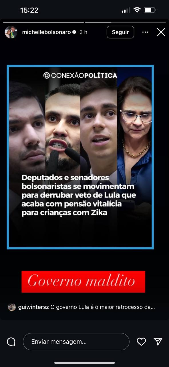 Michelle compartilhou uma notícia nos Stories de seu perfil no Instagram e escreveu a seguinte mensagem: “Governo maldito”. Com a decisão do presidente, as famílias receberão uma indenização única de R$ 60.000. O pagamento beneficia nascidos entre 1º de janeiro de 2015 e 31 de dezembro de 2024.