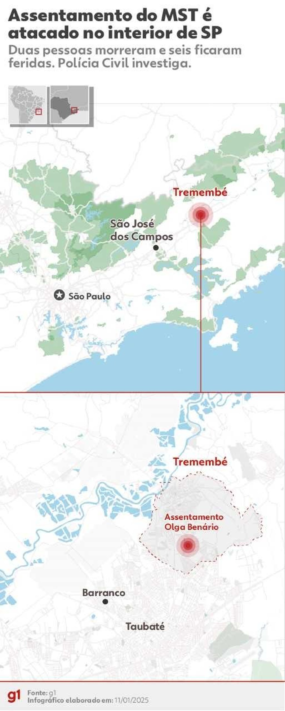 Dois homens foram mortos a tiros e seis pessoas ficaram feridas após serem baleadas, na noite desta sexta-feira (10), durante um ataque a um assentamento do MST (Movimento dos Trabalhadores Rurais Sem Terra), na zona rural de Tremembé, no interior de São Paulo.