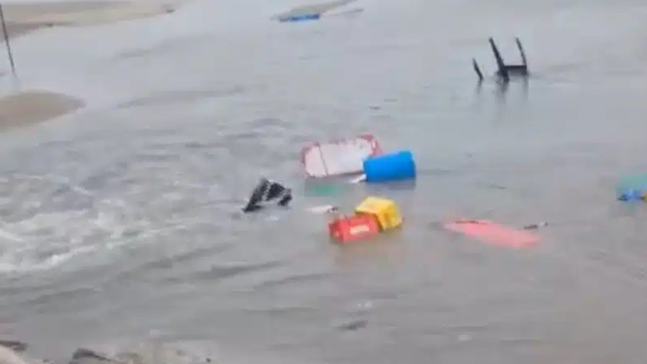 A força da chuva provocou o rompimento de bueiros, que lançaram uma grande quantidade de água e esgoto diretamente na orla da praia. A correnteza carregou diversos materiais pertencentes aos trabalhadores da área, incluindo barracas, cadeiras e caixas. Muitos desses itens foram arrastados para longe ou ficaram enterrados na lama que se formou sobre a areia.