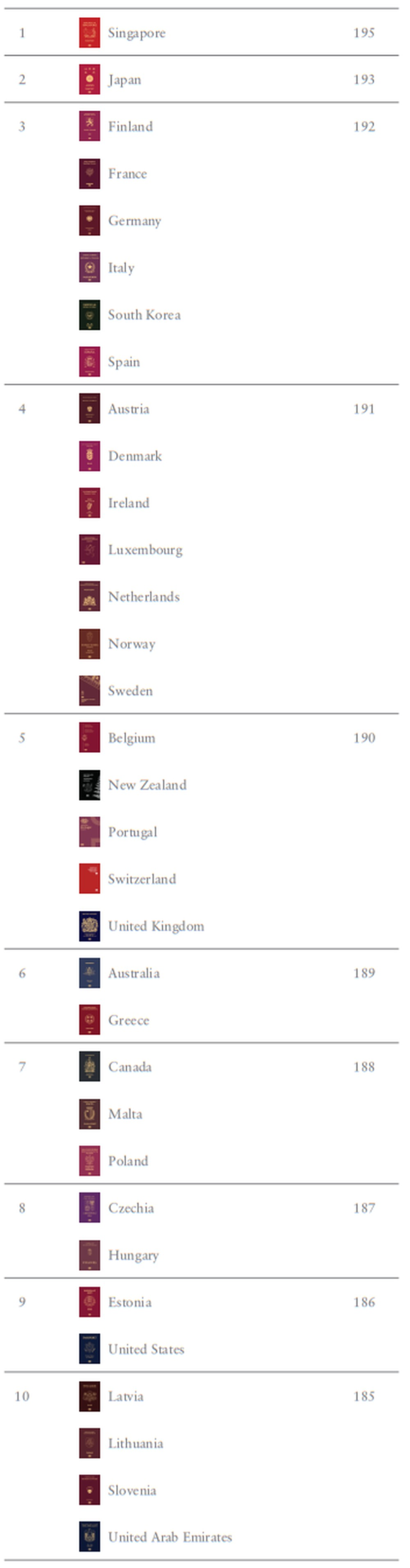 O critério é a quantidade de países para onde é permitido viajar sem vistos. O passaporte português abre as portas para 190 destinos. Ao lado de Portugal estão Bélgica, Nova Zelândia, Suíça e Reino Unido.