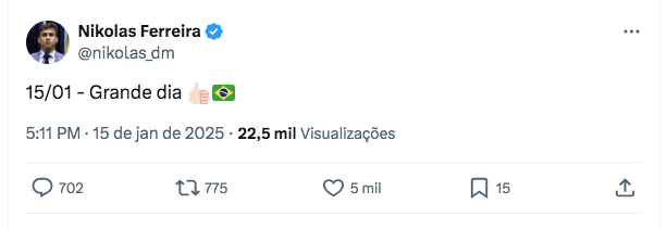 – 15/01 – Grande dia – escreveu o parlamentar na rede X.