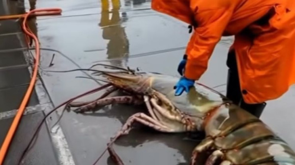 O maior camarão da história. Nas cenas o crustáceo é capturado e examinado por um pescador.