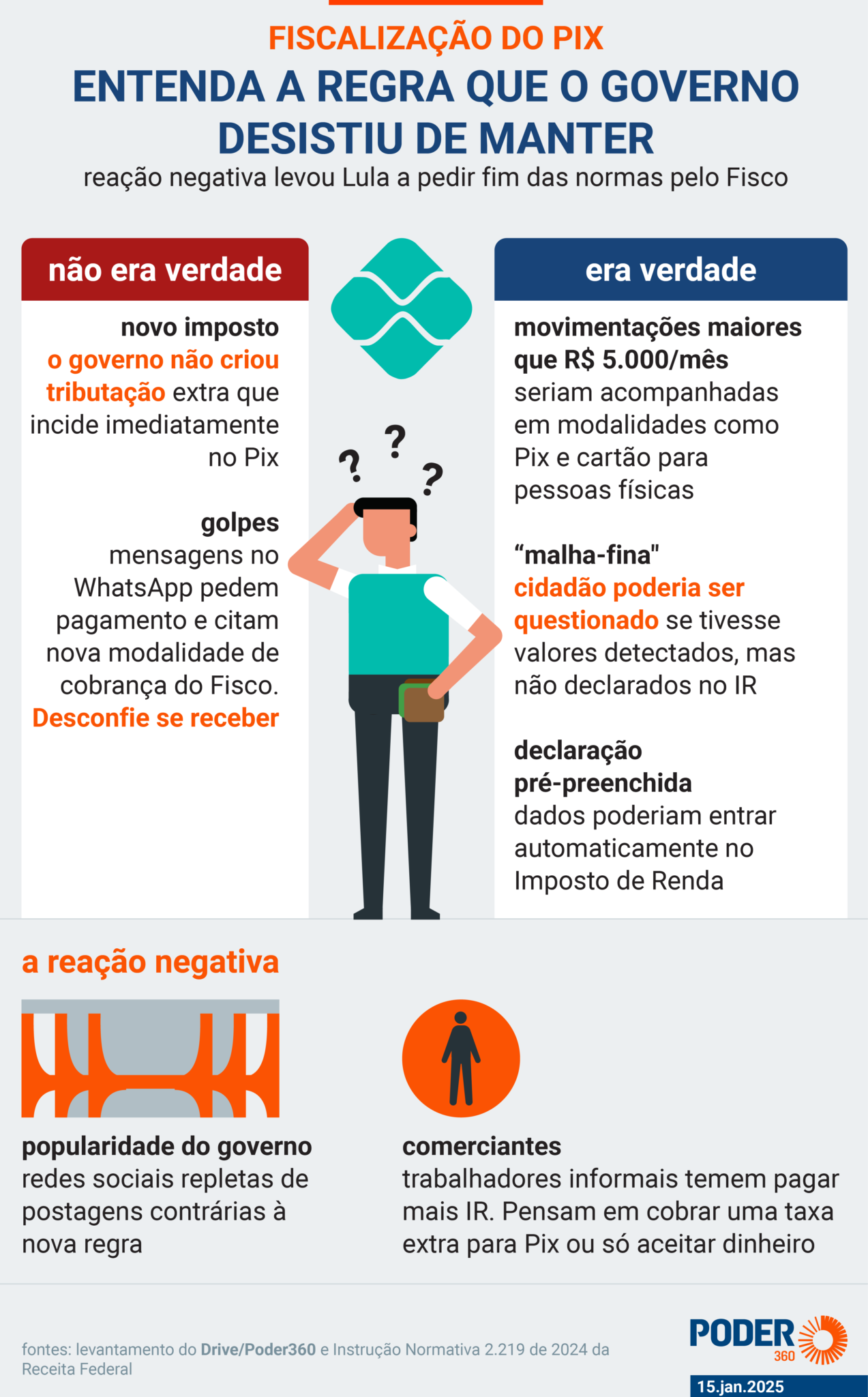 A Receita Federal derrubou instrução normativa que aumentava a fiscalização sobre transferências acima de R$ 5.000 do Pix de pessoas físicas. A iniciativa não criava uma taxa extra do governo para a operação, como informaram publicações nas redes sociais que acuaram o governo e forçaram um recuo.