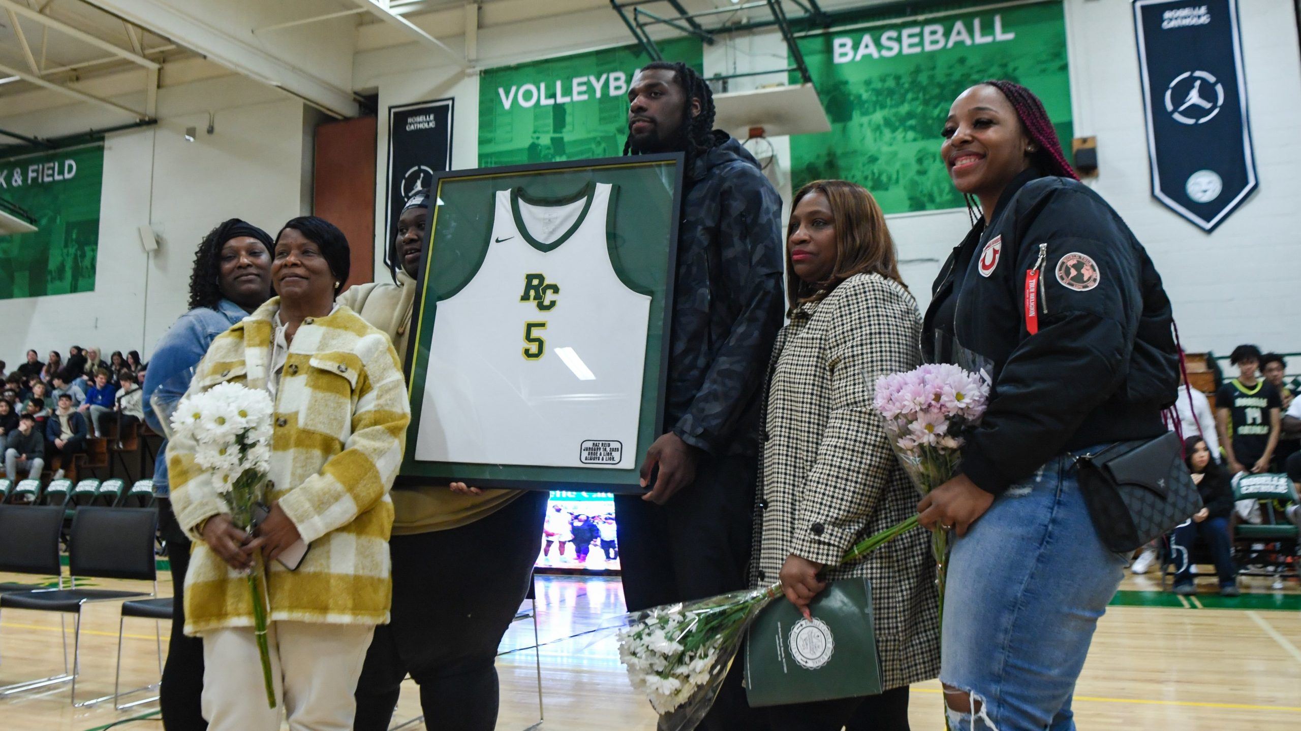 O ex-destaque do Roselle Catholic foi homenageado no intervalo, com sua camisa 5 se tornando a primeira camisa aposentada na longa história da escola.