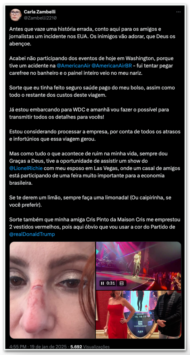 A deputada federal Carla Zambelli (PL-SP) disse neste domingo (19.jan.2025) que sofreu um acidente ao tentar pegar um absorvente no banheiro de um avião da American Airlines. A congressista está nos Estados Unidos para acompanhar a posse de Donald Trump (Republicano) em Washington, D.C. na próxima 2ª feira (20.jan).