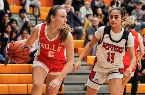 Kaylee Lauber (2) de Somerville move a bola contra Christa Ramos (11) de Netuno durante o NJSIAA Central Jersey, jogo das quartas de final de basquete feminino do Grupo 3 entre Somerville e Neptune na Somerville High School em Somerville, NJ na terça-feira, 27 de fevereiro , 2024.Scott Faytok | Mídia avançada de NJ