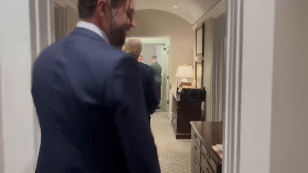 Acompanhado de Donald Trump e do Presidente da Câmara Mike Johnson, o vice-presidente JD Vance entra pela primeira vez no Salão Oval da Casa Branca.