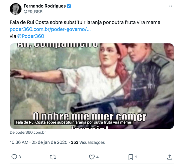 Internautas fizeram memes após o ministro da Casa Civil, Rui Costa, afirmar, nesta sexta-feira (24), que a população pode substituir a laranja por outra fruta se os preços estiverem muito caros. A declaração foi dada ao falar sobre a possibilidade de o governo Lula (PT) reduzir o imposto de importação de alimentos que estejam mais caros no Brasil do que no exterior.