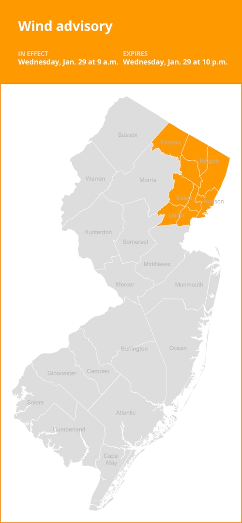 Na quarta -feira, às 3:09, o Serviço Nacional de Meteorologia emitiu um aviso de eólica válido para quarta -feira entre as 9h e as 22h para os condados de Passaic, Hudson, Bergen, Essex e Union.
