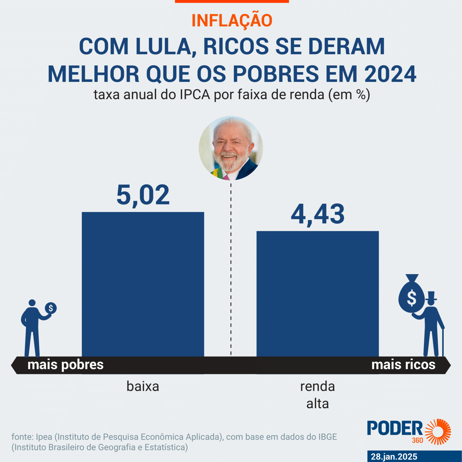 Conforme as estatísticas do IBGE, que pesquisa e calcula a inflação oficial do Brasil, o IPCA, em 2024 quem tinha renda alta enfrentou uma taxa média de 4,43% nos preços dos produtos que consumiu no ano passado. Já quem tem renda baixa ficou uma taxa maior, de 5,02%.