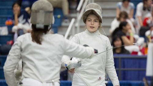 Alessandra Cooney, da Chatham (à direita), elogia o adversário Alyssa Roberts, da Escola Lawrenceville, depois de sua luta pelo Saber no torneio de esgrima das meninas da Santelli High School na Universidade Drew, em Madison, no sábado. 20/01/2024 Steve Hockstein | Para NJ Advance MediaSteve Hockstein | Para NJ Advance