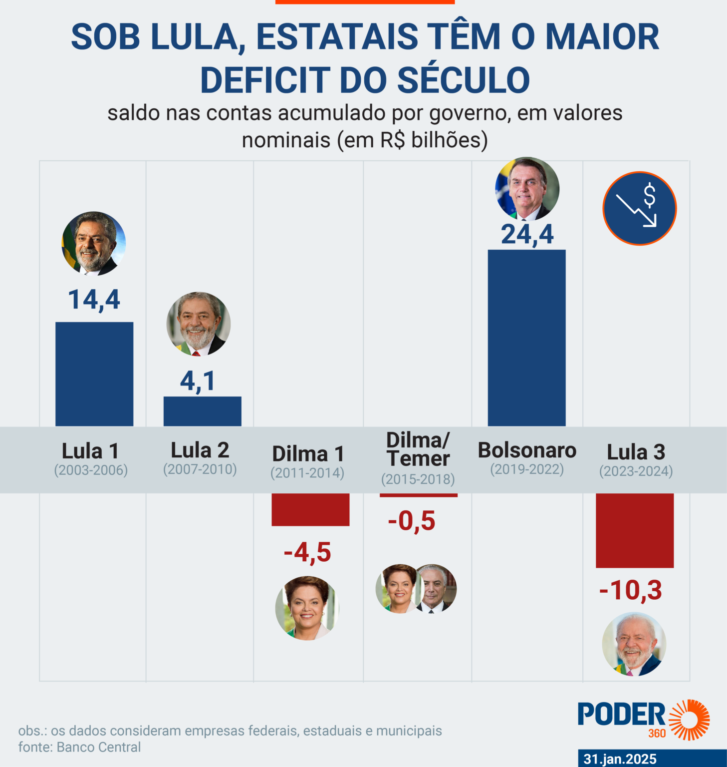 As estatais fecharam 2024 com o maior deficit da série histórica, iniciada em 2002. O saldo negativo foi de R$ 8,07 bilhões em valores nominais, segundo dados do BC (Banco Central), que divulgou o relatório “Estatísticas Fiscais” nesta 6ª feira (31.jan.2025).