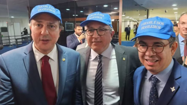 Ministros e lideranças do governo colocaram um boné azul na cabeça com os dizeres “o Brasil é dos brasileiros”, em um recado a Donald Trump.