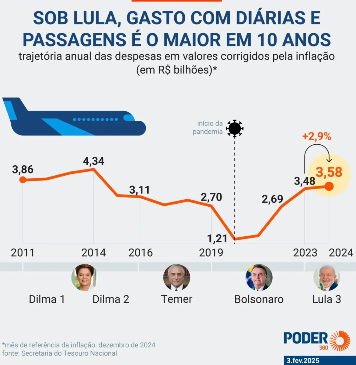 Esse montante é o maior desde 2014, no governo de Dilma Rousseff (PT), quando os custos com diárias e passagens somaram R$ 4,34 bilhões. A série histórica desses gastos começou em 2011, com dados fornecidos pelo Tesouro Nacional, incluídos no relatório do resultado primário de dezembro de 2024.