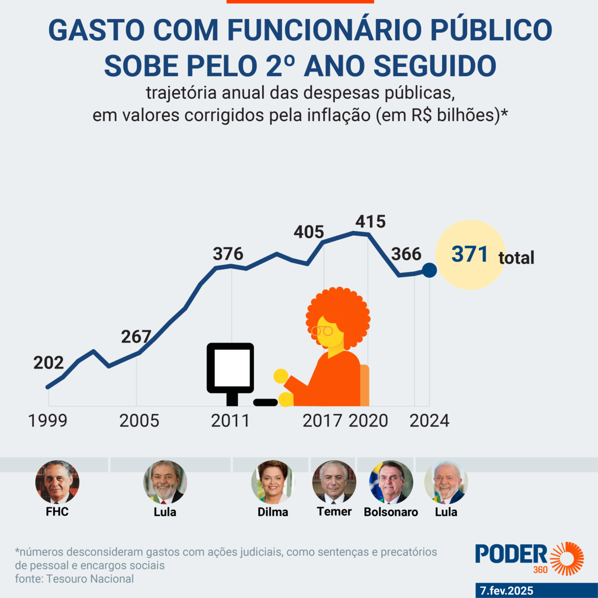 Os gastos recorrentes com funcionários públicos da União somaram R$ 370,6 bilhões em 2024. Esse foi o maior valor desde 2021, quando totalizou R$ 389,1 bilhões, em valores corrigidos pela inflação. O governo Luiz Inácio Lula da Silva (PT) registrou o 2º ano de alta seguido nas despesas com o pessoal e encargos sociais.