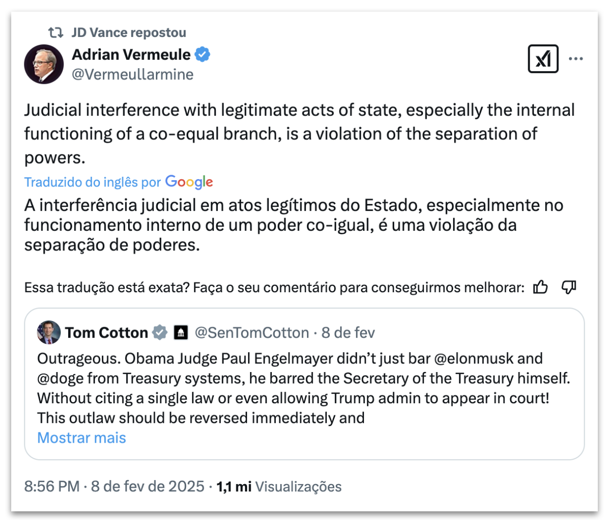 No sábado (8.fev.2025), Vance compartilhou em seu perfil no X uma publicação de Adrian Vermeule, professor da escola de direito de Harvard, que criticou a decisão do juiz federal Paul Engelmayer, de um tribunal em Nova York, de proibir acesso do Doge aos dados da Secretaria do Tesouro. “A interferência judicial em atos legítimos do Estado, especialmente no funcionamento interno de um poder equivalente, é uma violação da separação de poderes”, escreveu Engelmayer –e teve o endosso de Vance.