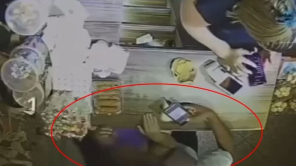 Câmeras de segurança de um comércio no município gravaram o momento em que uma criança está no balcão do caixa para comprar algo, acompanhada de outra, que aparenta ser mais nova.