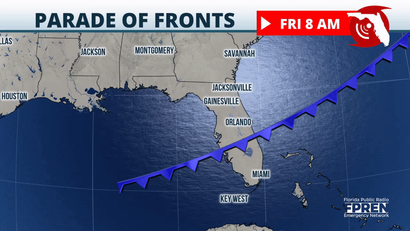 O Panhandle recebeu uma rodada de tempestades na quinta -feira de manhã, e algumas dessas tempestades se mudaram para o norte da Flórida, quando a frente se movia para o leste. Essa frente continuará a se mover para o leste, mas também perderá parte de seu soco, pois começa a se retrair para o norte novamente e se tornar estacionário, envolvendo a Flórida Central até o sábado.