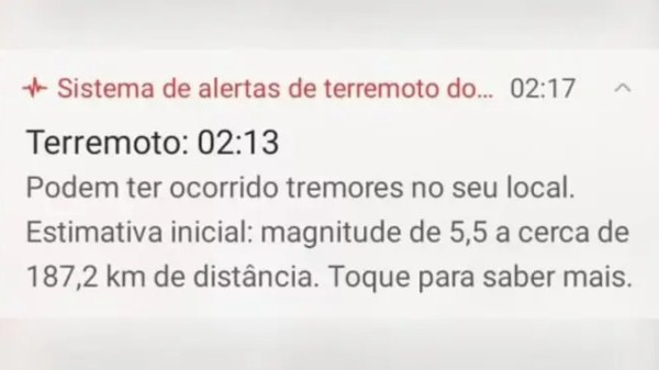 O aviso apareceu nos celulares com o sistema operacional Android, mas foi desmentido pela Universidade de São Paulo (USP). A Defesa Civil do Estado também afirmou não ter registrado nenhum tremor na região.