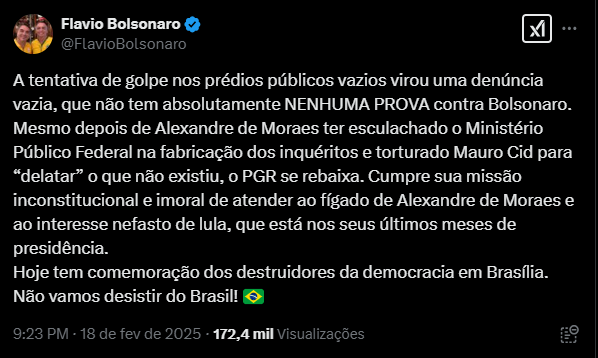 – Mesmo depois de Alexandre de Moraes ter esculachado o Ministério Público Federal na fabricação dos inquéritos e torturado Mauro Cid para “delatar” o que não existiu, o PGR se rebaixa. Cumpre sua missão inconstitucional e imoral de atender ao fígado de Alexandre de Moraes e ao interesse nefasto de lula, que está nos seus últimos meses de presidência – escreveu Flávio.