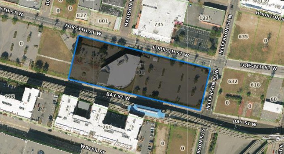 O ex -prédio da Interline Brands Inc. e seu estacionamento estão em 2,85 acres a 801 W. Bay St. A proposta de troca de terras faria a cidade se apropriar do local e depois a transferir para a universidade.