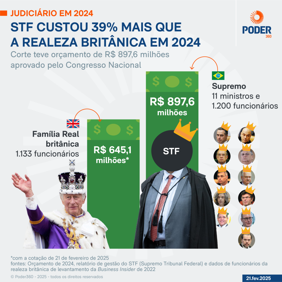 O STF (Supremo Tribunal Federal) teve Orçamento de R$ 897,6 milhões em 2024, valor 39% superior aos gastos da Família Real britânica, que custou R$ 645,1 milhões aos cofres públicos do Reino Unido no ano passado, em valores convertidos.