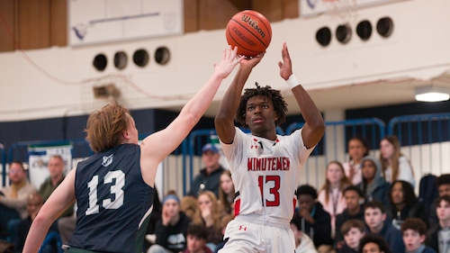 Jaden Simon, da Newark Academy (à direita), atira em Van Girton Marshall de Montclair Kimberley na final de basquete Boys Prep B High School na quarta -feira em Montclair. Os Minutemen superaram os pumas para uma vitória por 48 a 35. 14/02/2024 Steve Hockstein | Para NJ Advance MediaSteve Hockstein | Para NJ Advance