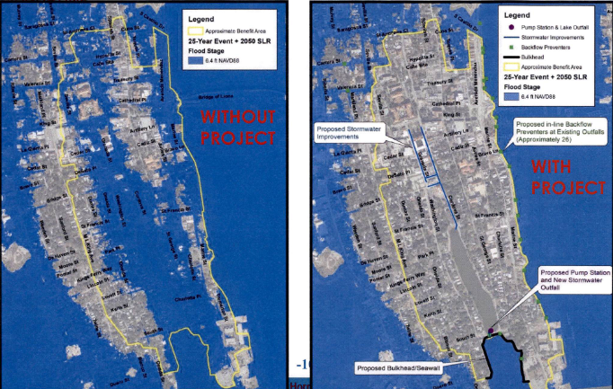 Os gráficos preparados pela cidade de Santo Agostinho ilustram a eficácia do paredão e da bomba da cidade ao longo do lago Maria Sanchez, para impedir a prevenção de inundações costeiras no centro da cidade. | Cidade de Santo Agostinho